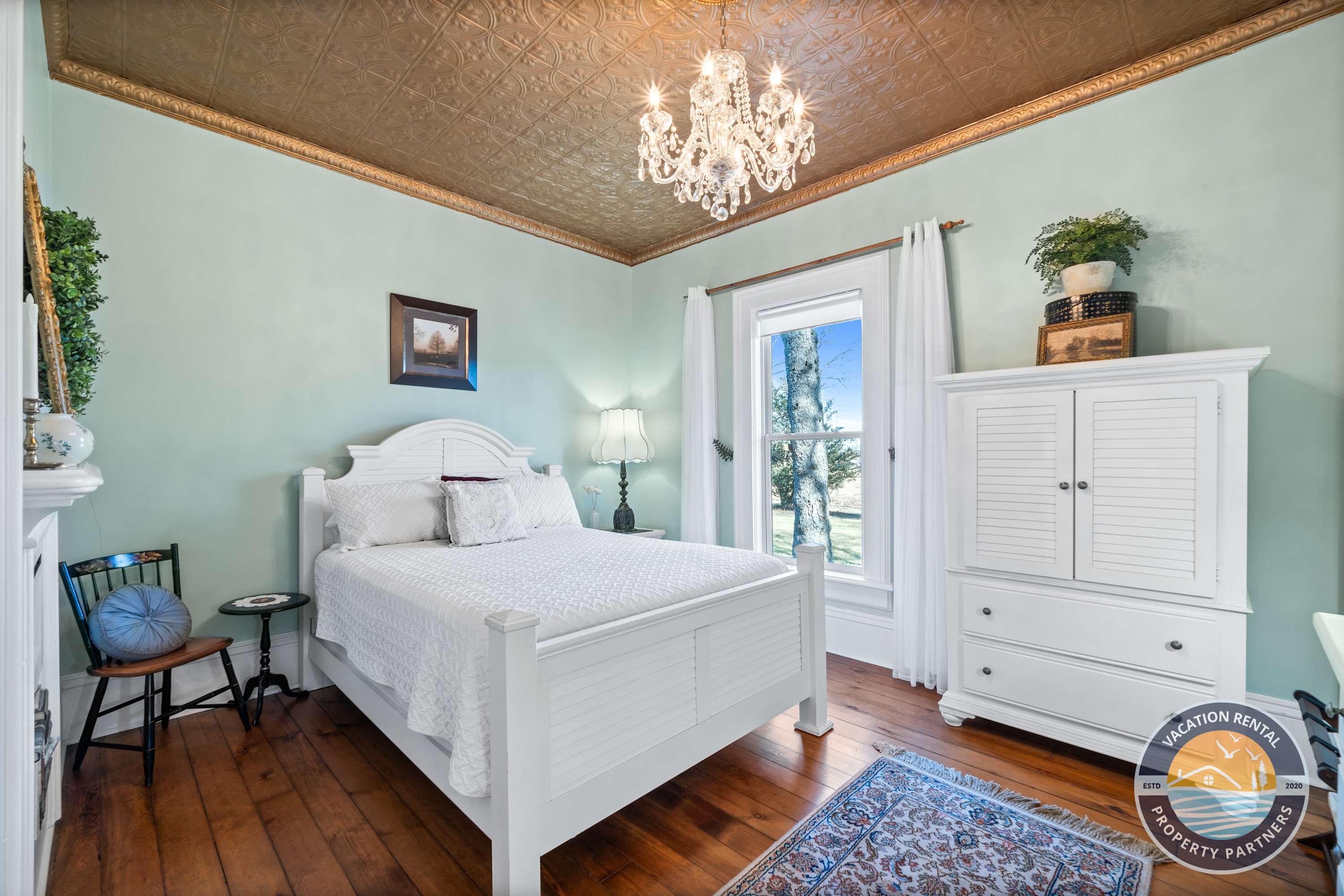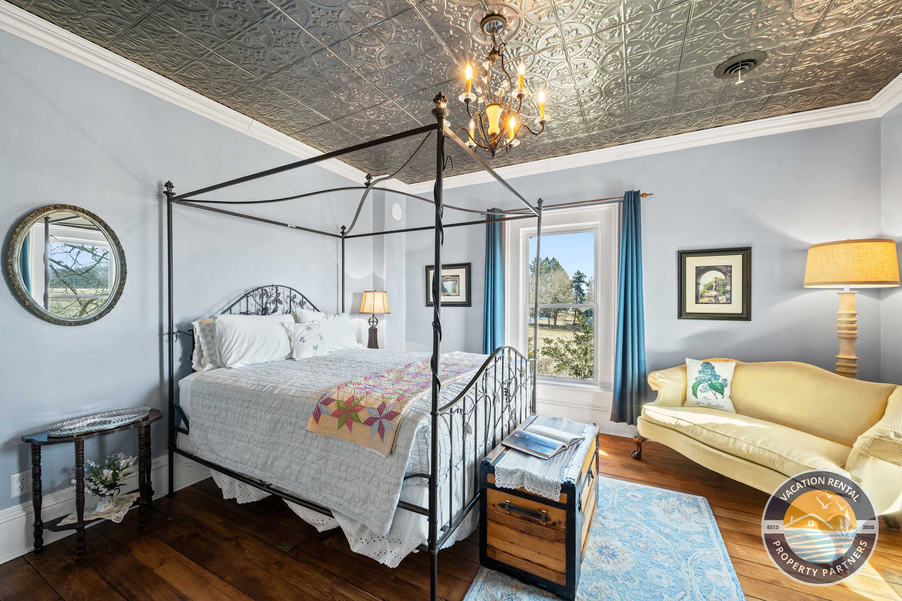 • Bedroom 1: Queen bed, stunning curved wall, ornate tin ceiling